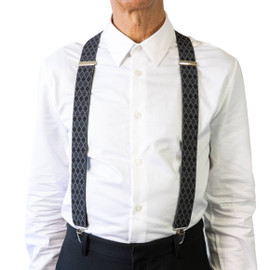 Elevate your everyday look with these X-back suspenders in a bold grey Harlequin print, finished with reliable nickel clips.