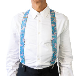 These Y-back suspenders feature a refined black paisley pattern with nickel clips, classic style with a touch of fun.